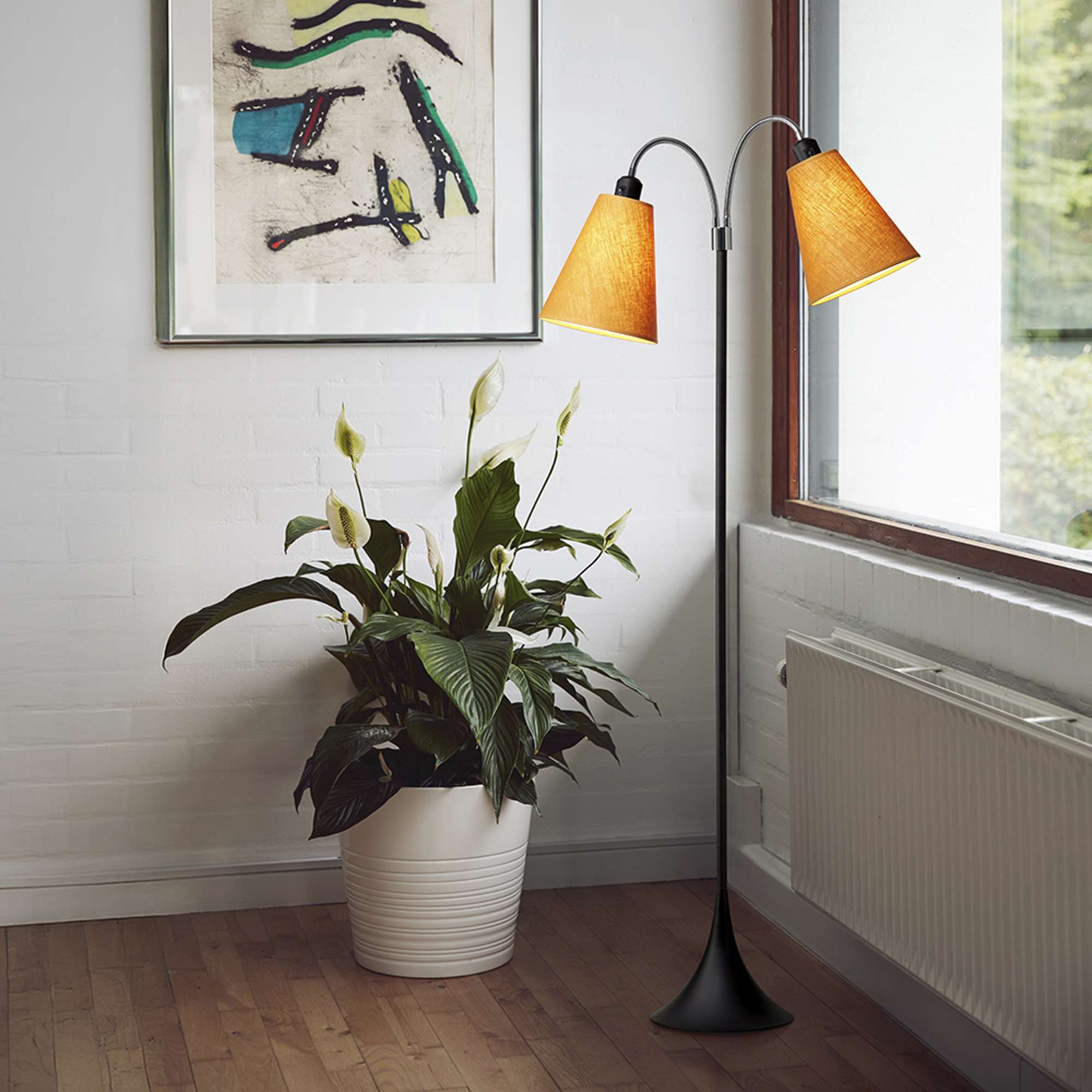 Fodgænger Gulvlampe i sort med karryfarvede lampeskærme er den perfekte tilføjelse til dit hjem. Med en højde på 135 cm og en bredde på 25 cm, skaber denne lampe en stilfuld og moderne atmosfære i ethvert rum. Den er fremstillet i holdbart metal, hvilket sikrer langvarig brug og kvalitet, der kan ses og mærkes.