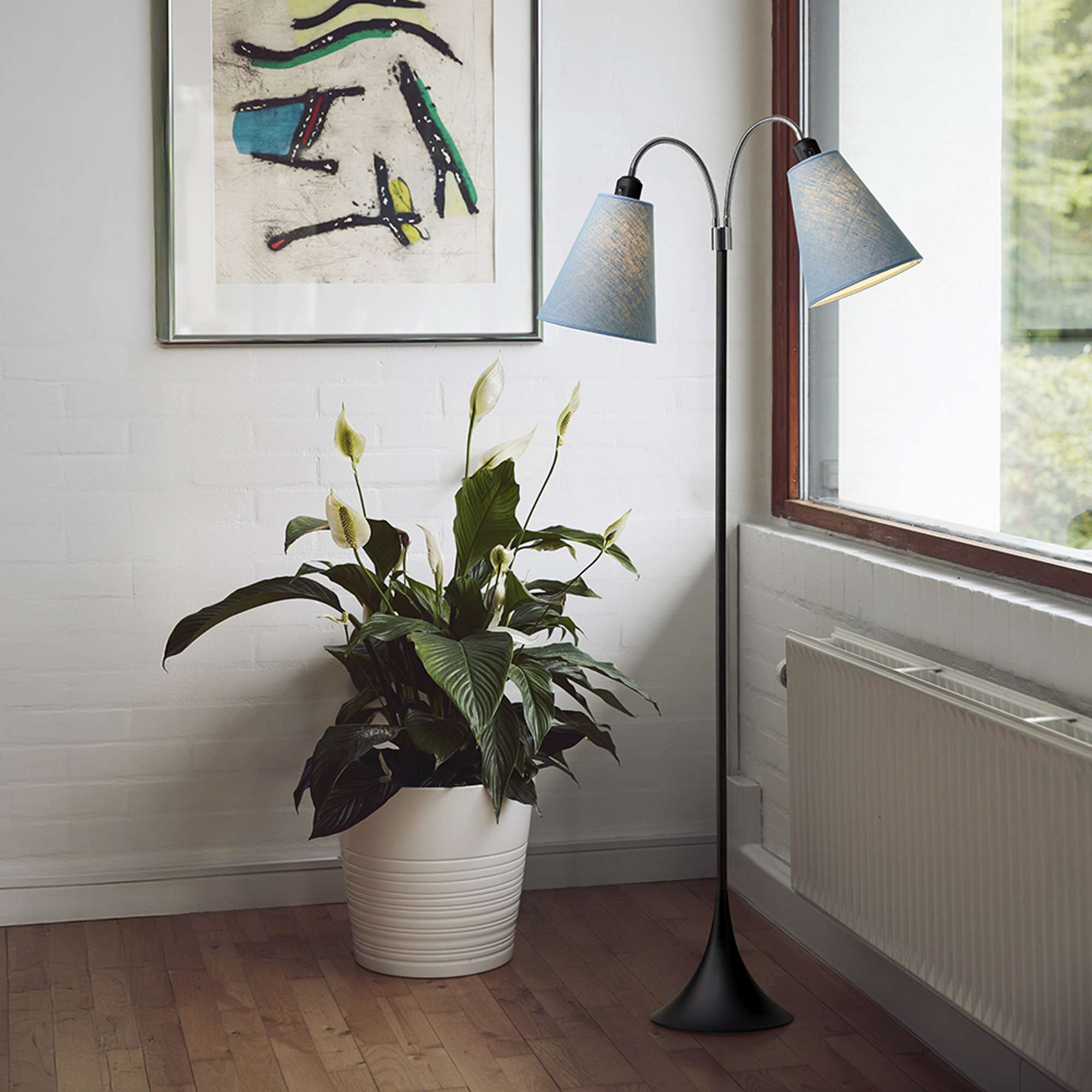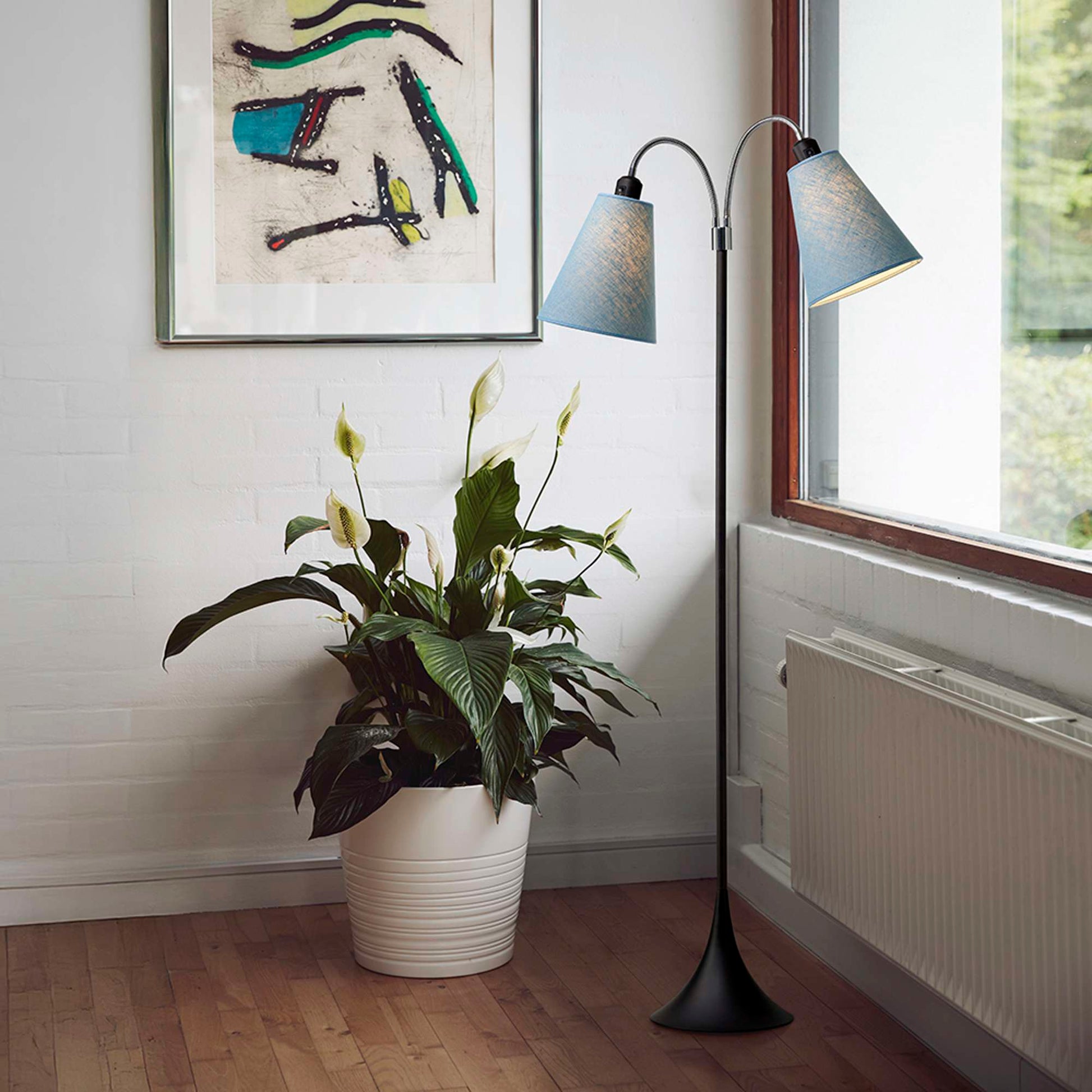 Vælg Fodgænger Gulvlampe i sort med støvet blå lampeskærme for at skabe en indbydende og hyggelig atmosfære i dit hjem. Med vores fokus på kvalitet og design, kan du stole på, at denne lampe vil være en værdifuld tilføjelse til din indretning i mange år fremover.