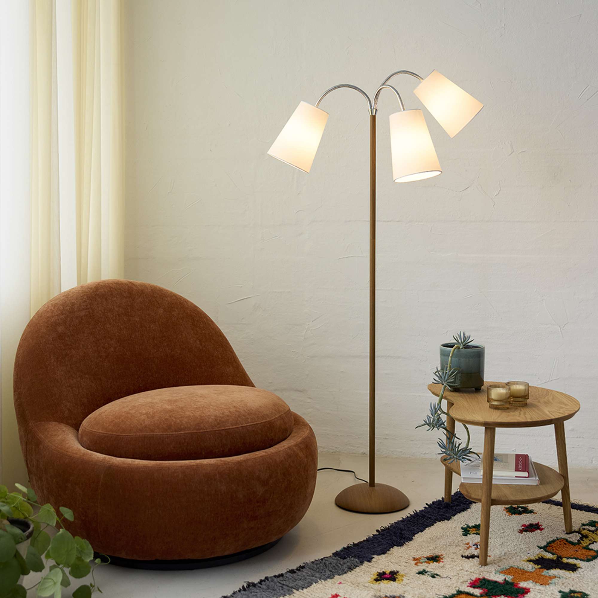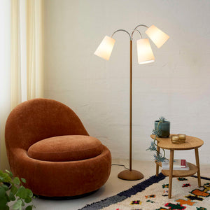 Giv dit hjem et stilfuldt løft med Salsa Gulvlampe i trælook, der kombinerer moderne design med en varm atmosfære. Denne lampe er ikke bare en lyskilde, men en ægte indretningsdetalje, der vil tiltrække opmærksomhed i ethvert rum. Med sine tre hvide lampeskærme i blødt bomuld skaber den en behagelig belysning, perfekt til hyggelige stunder eller læsning i sofaen.