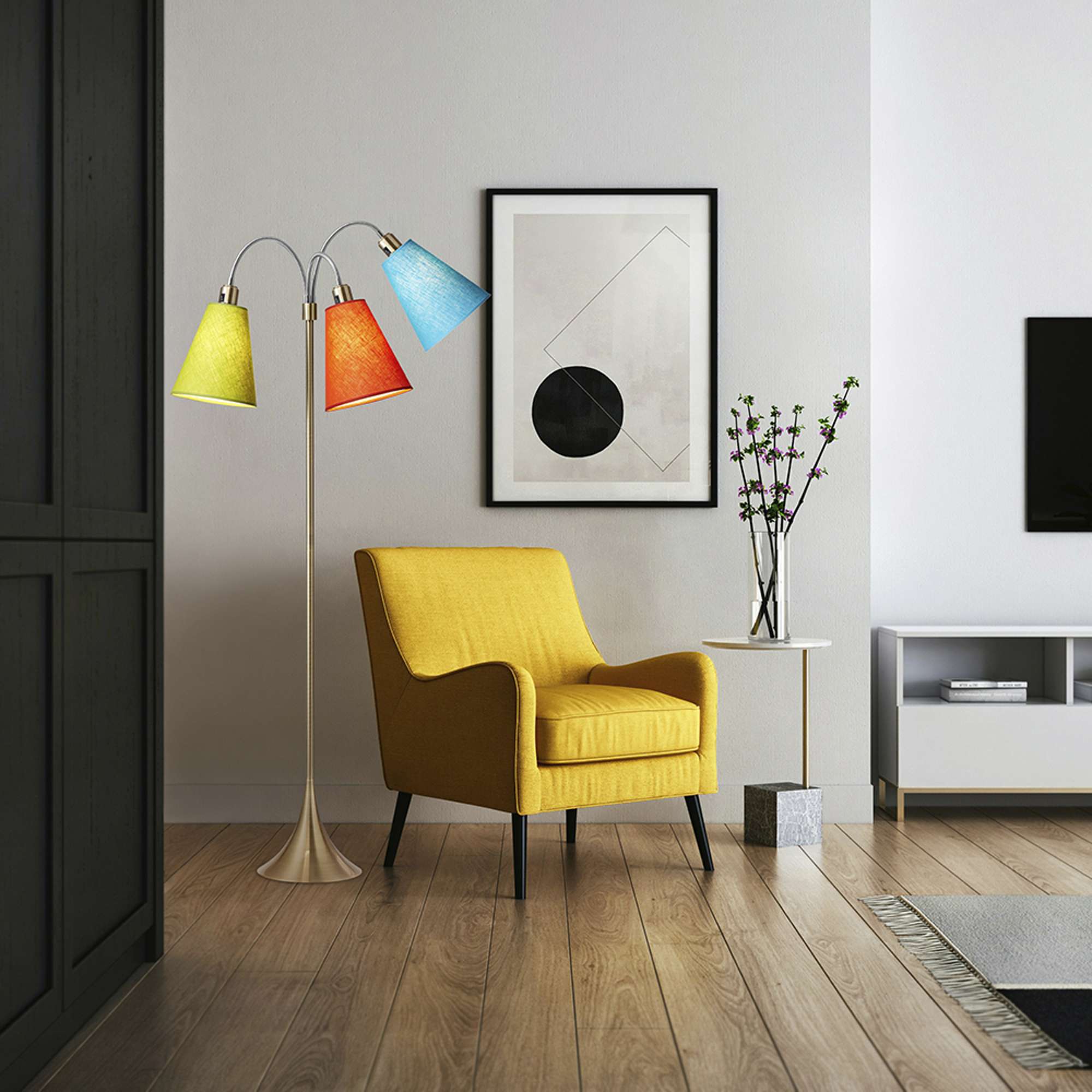 Trafik Gulvlampe Antik messing – m/limegrøn, orange og turkis lampeskærme