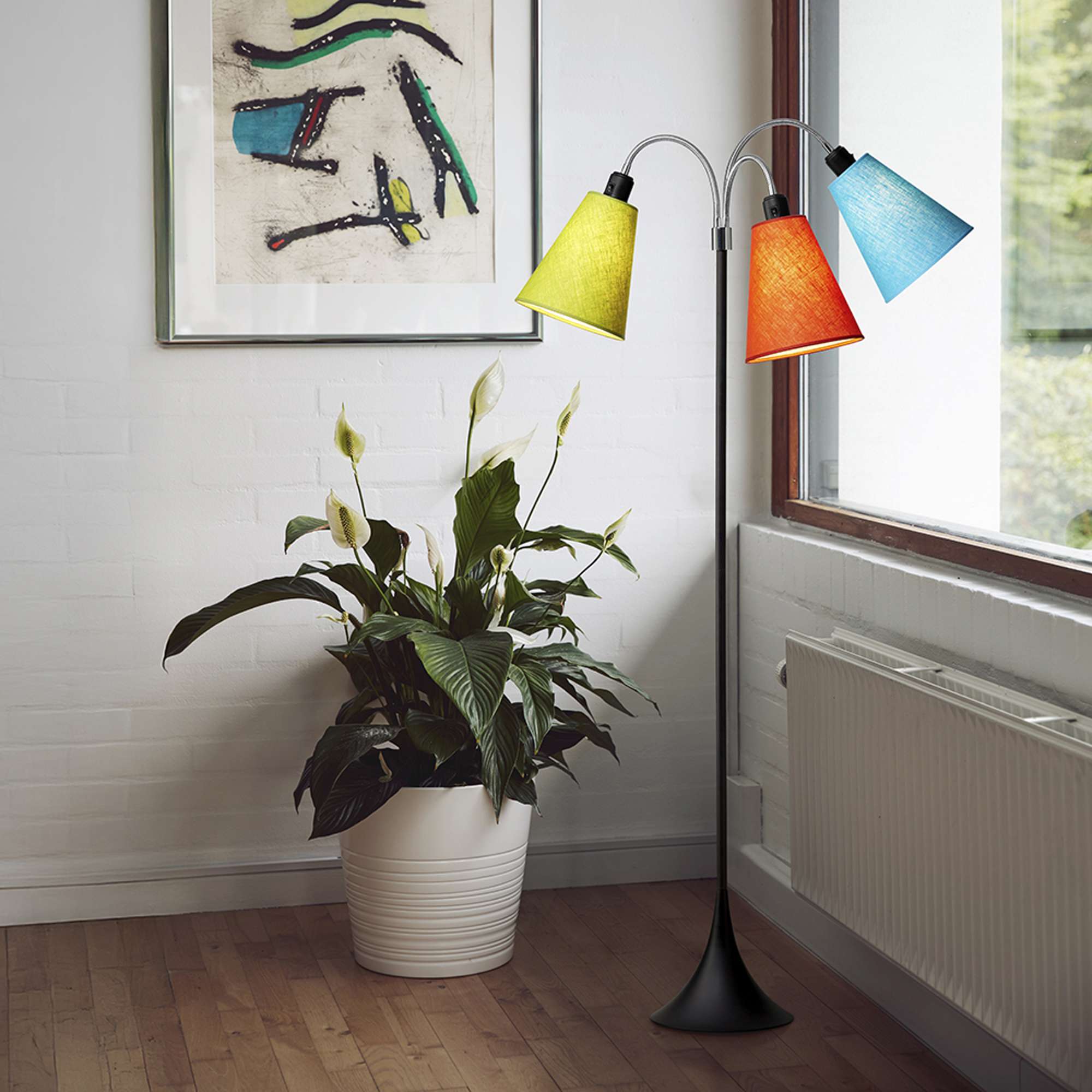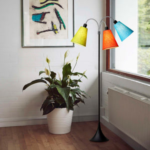 Trafik Gulvlampe Sort – m/limegrøn, orange og turkis lampeskærme